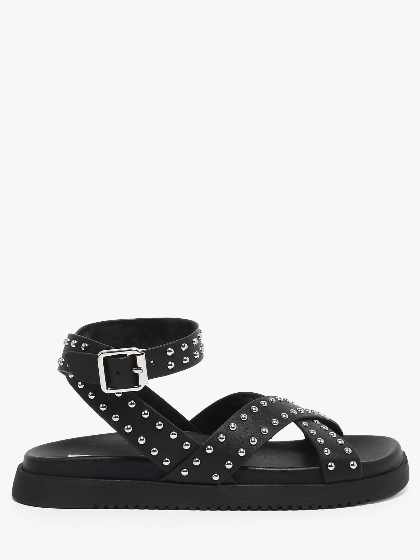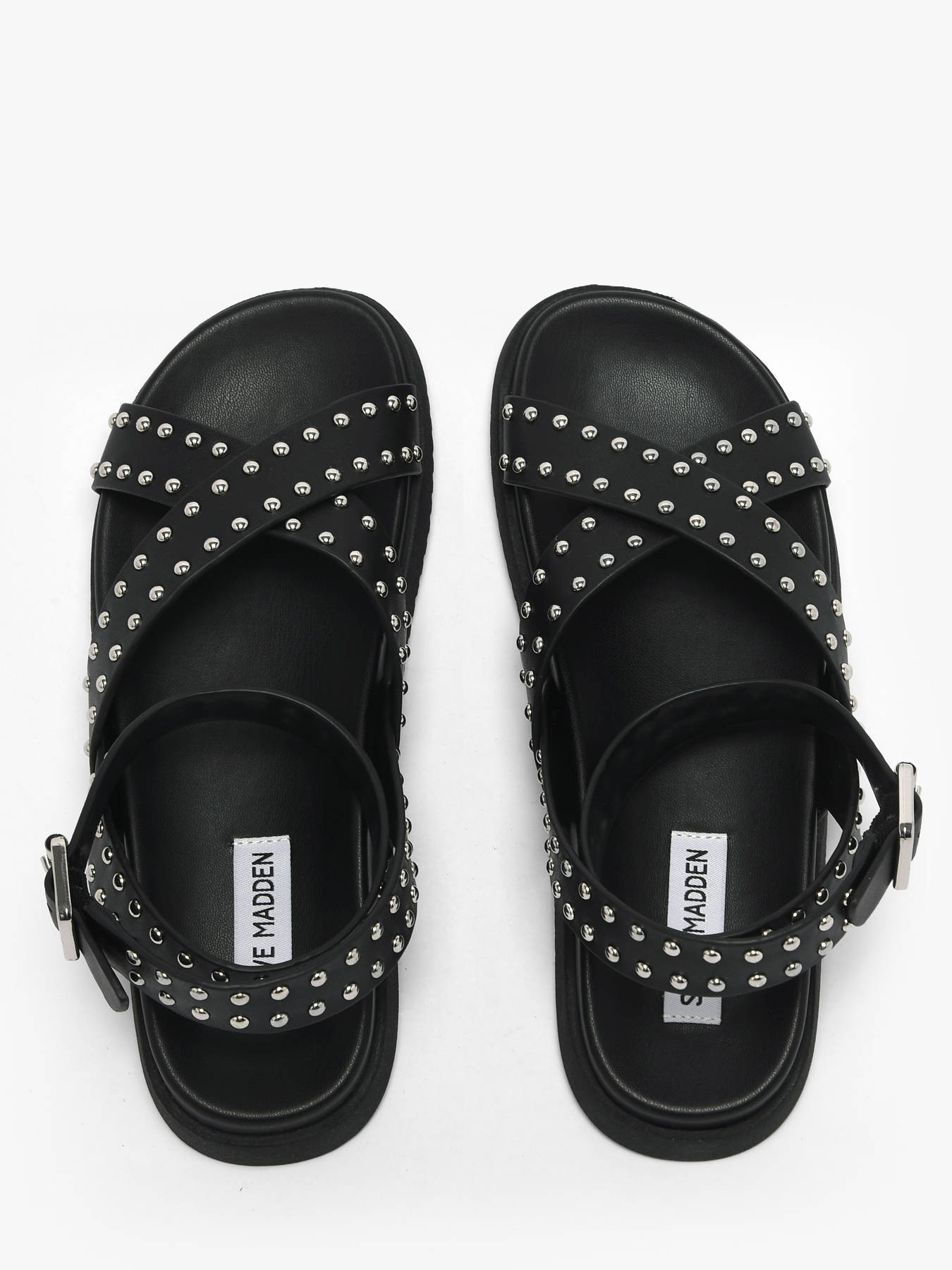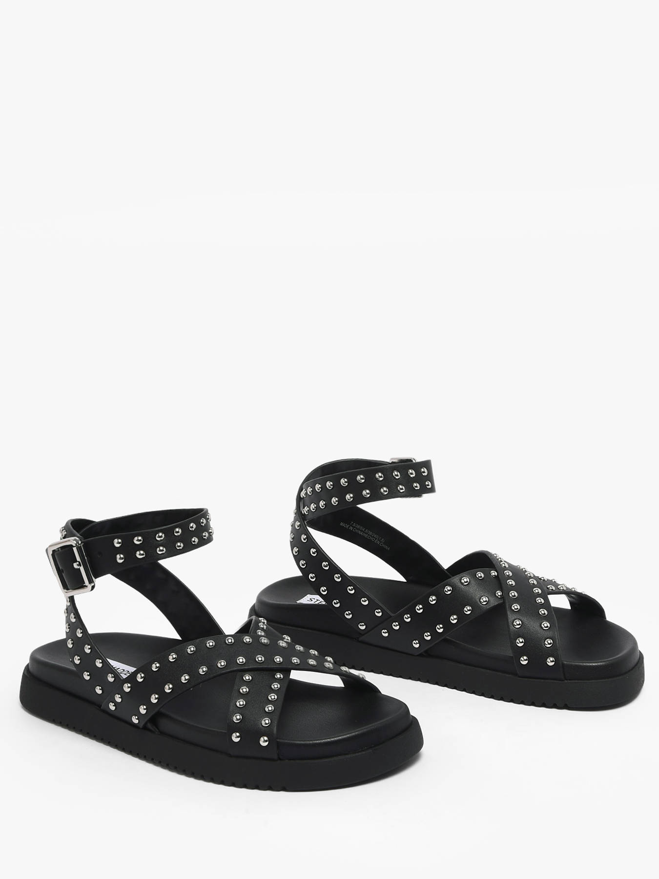 The Steve Madden My Bestie sandals combine boldness and elegance with a contemporary, statement-making style. Crafted from smooth black leather, they feature crossed straps adorned with silver studs and an adjustable ankle buckle for perfect fit and support. The leather lining and synthetic insole provide all-day comfort, while the thick black sole ensures stability and durability. Perfect for elevating summer outfits or adding a chic-rock touch, these sandals reflect Steve Madden’s bold, dynamic, and distinctly individual spirit in a modern, sophisticated design.