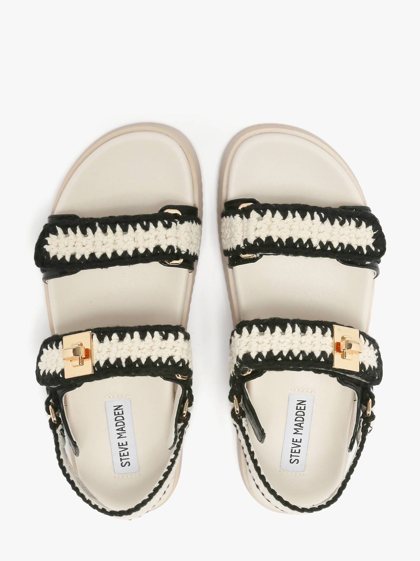 The Mona sandals by Steve Madden reinvent the classic three-strap design with a flat sole and molded footbed for optimal comfort. Available in black and white, they stand out with bold gold-tone hardware that elevates the style. The upper combines leather and textile, while the lining is textile and the insole synthetic, offering both comfort and chic appeal. These sandals embody Steve Madden’s contemporary fashion spirit—bold, dynamic, and unmistakably individual—making them perfect for those seeking trendy shoes that blend elegance and originality effortlessly in everyday wear.