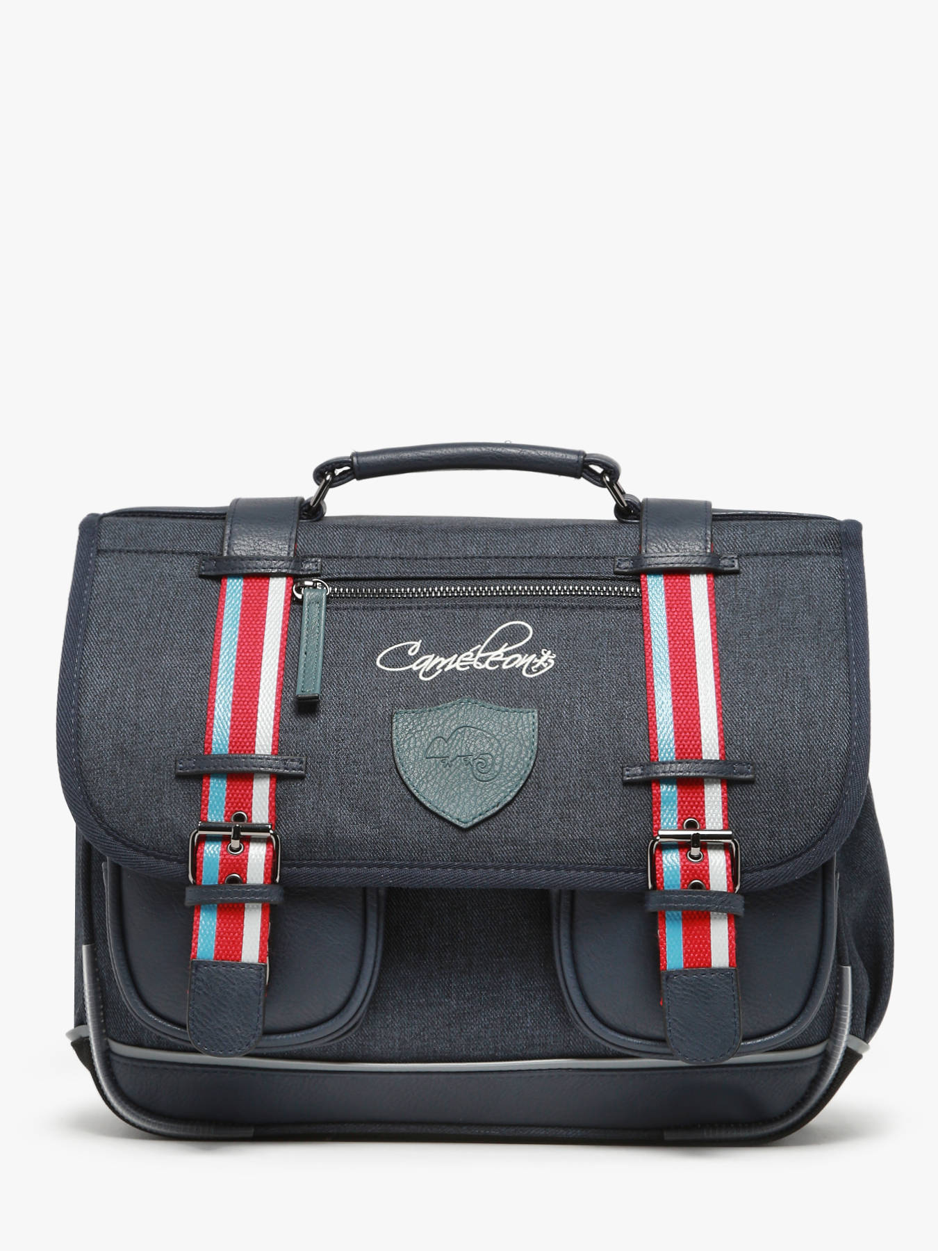 35 cm - 12 liters - 1 kg ~ 14-inch Satchel from the vintage collection of the French brand Cameleon, perfect for any child starting primary school! The particularity of this model is its vintage look : finishing touches and the beautiful zipped-pocket on the flap. It has two compartments for notebooks and a little zipped-pocket, as well as a place made on purpose for the ruler. It closes thanks to a flap and two clasps. It also has two little zipped pockets on the front, very useful to take a snack for example. Little plus, a nametag on the back of the satchel allows you to write the name of your child. This model is very comfortable thanks to padded back and shoulder straps. So as to not damage the schoolbooks, the bottom of the satchel is reinforced. For the security of your child, reflective strips have been placed all around on the bag and on the straps.